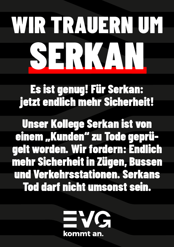 Heute Morgen ist unser Kollege Serkan C. seinen Verletzungen des Übergriffs von Montag, erlegen... Dies bestürzt uns alle zutiefst – schon wieder ein Übergriff auf Beschäftigte, welche nur eine Fahrscheinkontrolle durchführen...