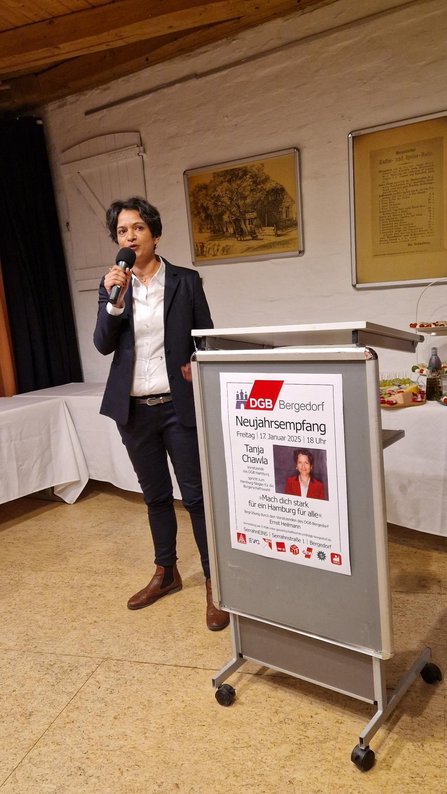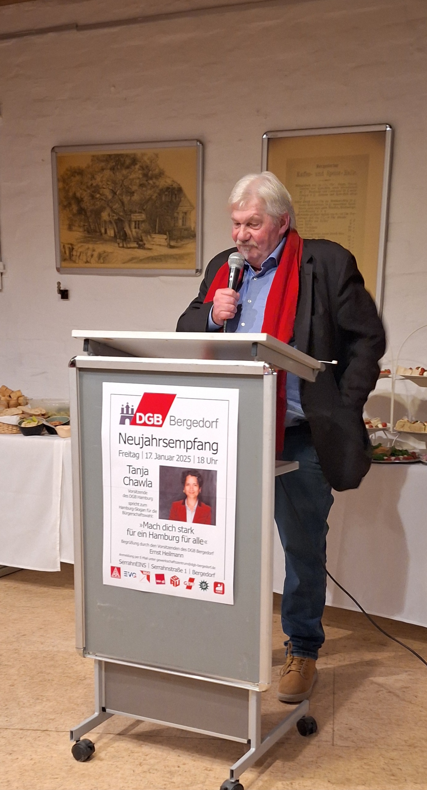 Jedes Jahr im Januar laden wir die Politik und engagierte Zivilgesellschaft Bergedorfs zu unserem traditionellen Neujahresempfang ins Serrahn Eins ein. Der Neujahrsempfang des DGB Bergedorf ist ein Ort des Austausches, der Bündnisarbeit und ein wichtiger Termin für die Platzierung unserer aktuellen DGB-Forderungen. Zu unseren Gästen zählen unter anderem die Vertreter*innen der demokratischen Bergedorfer Parteien sowie Verbände und Gewerkschaften aus Bergedorf.