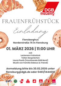 Anlässlich des internationalen Frauentages laden wir herzlich zu unserem traditionellen Frauenfrühstück nach Flensburg ein. Mit dabei sind Laura Pooth, Vors. DGB Nord und Lisa Vordermeier-Weinstein, Regionsgeschäftsführerin mit Musik von Familie Dabous & Friends. Für die Teilnahme ist unbedingt eine Anmeldung bis zum 20. Februar erforderlich. E-Mail: flensburg@dgb.de oder Telefon 0461 1444010